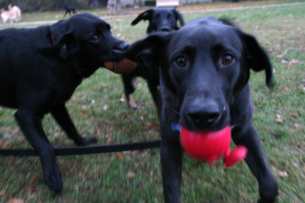 Pacifica is quite a ways from the dog park, so I didn't get to play with Parker and the gang this morning. Still, I've puzzled over two phenomena about Parker's play group: first, the preponderance of male dogs whose names end in "-er," and second, that almost all the dogs are either black or yellow. Here's Parker with his friends Boo and Tucker:
