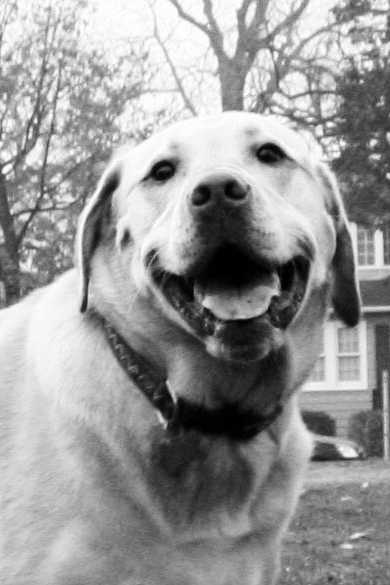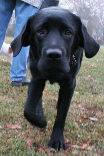 But the yellow dogs present a problem. Three of them are Labradors of similar sizes, and until Monday all three of them wore blue collars. (Buck, opposite, now has a lighter-color collar with a zig-zag motif.) At any distance greater than one's eyeglasses prescription it's nearly impossible to tell them apart.