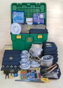 Each is a 49-gallon box containing a tent, ten sleeping bags, cookware, water jugs (sans water) and other neccesities that people need immediately following a disaster.
