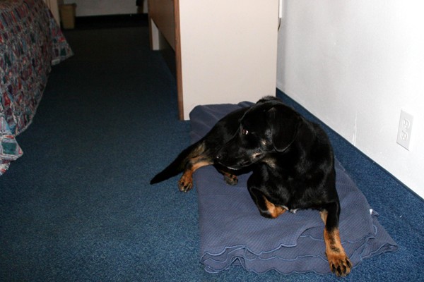 I didn't know it until last week, but most Motels 6 (is that the plural? Has to be) allow dogs. I'm travelling for the holiday, so this made a huge difference. Parker, however, has no idea that absent the liberal pro-dog policy of the chain he'd be in perpetual day-care this week. I even brought his bed for him: