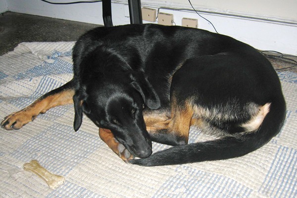 One week at overnight camp (Parker's day care provider also boards dogs, so he got to hang with his friends every day) has exhausted my dog. This is a common behavior in dogs, apparently. He was overjoyed to see me again in a way I've never seen in a human older than four, but as soon as we got home he climbed into his crate and passed out. (Actually he ate two entire bowls of kibble first.)