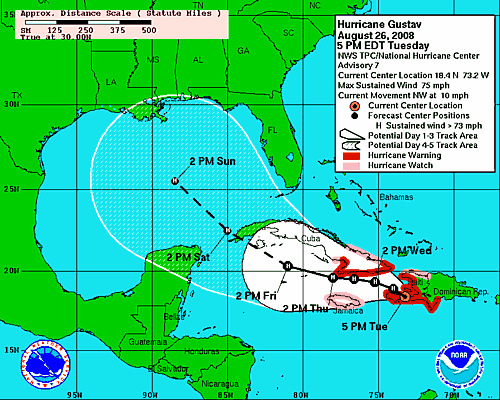 No, not me; Gustav. The National Hurricane Center forecasts the storm pointing straight at the Louisiana coast by this time Monday. True, six days out the error bars are pretty far apart, but New Orleans is right in the center of them.