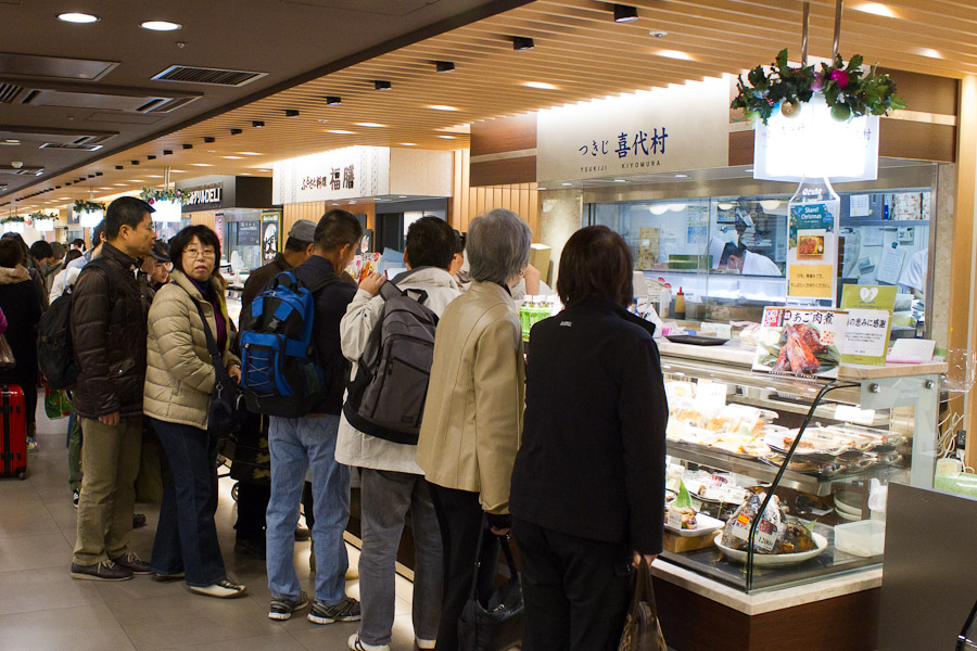 Back to Tokyo Station for lunch in one of the crowded food courts, where I sampled three different kiosks and only bit into one thing I didn't like. (I must remember to ascertain what part of the chicken is on the teppanyaki stick.)