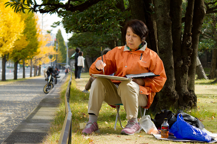From Shinjuku, I went around to Tokyo Station, and walked over to the Imperial Palace. You can't get near the place, really; there's even a moat around it, in case of siege engines. I did wander the outer garden, dodging bicycles and Japanese tourists, and finding an unusual (for me) number of people doing watercolors:
