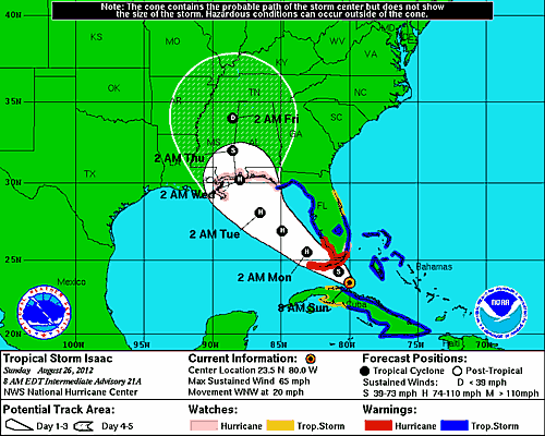 The Republican National Committee has cancelled the first night of their quadrennial convention because of Tropical Storm Isaac: