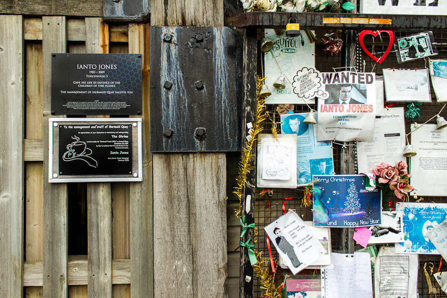 At the location the BBC used as the Torchwood 3 main entrance, the good people of the world have put up a shrine to fictional character Ianto Jones, which the Mermaid Quay management have sanctioned. As much as I found Torchwood to be an entertaining television show, and even though I went to Cardiff in part to see some of their shooting locations in person, I find this...creepy.