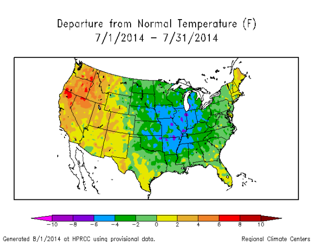 As this plot indicates, the observed range in July monthly temperatures in Illinois is 7°C. On another note, the July 2014 average temperature is based on preliminary data so it is very likely that we will break the tie with 2009 as more data arrives.