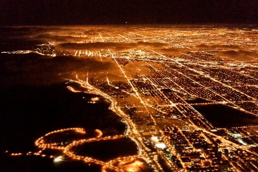 Photo: Chicago at night. Note the yellow-orange sodium vapor lamps.