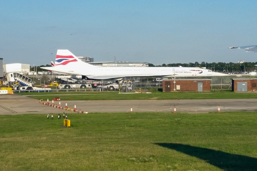 One of the few remaining British Airways Concorde airplanes is parked on the east side of Heathrow, and last Sunday my plane taxied right past it: