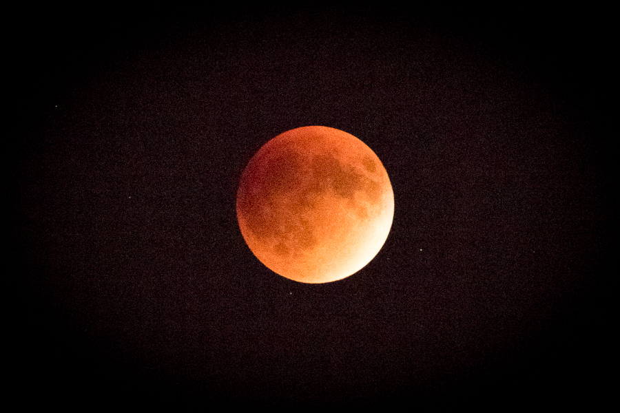 Note that it's a lot harder to photograph the moon when it's eclipsed. The full moon reflects 9% of the light falling on it, or about half as much as a standard gray card or green grass. So when shooting the moon, the correct exposure is surprisingly fast: about 1/250 at f/5.6 at ISO 100. Shooting the eclipse last night, I used 1/10 at f/5.6 at ISO-25600. And a tripod.
